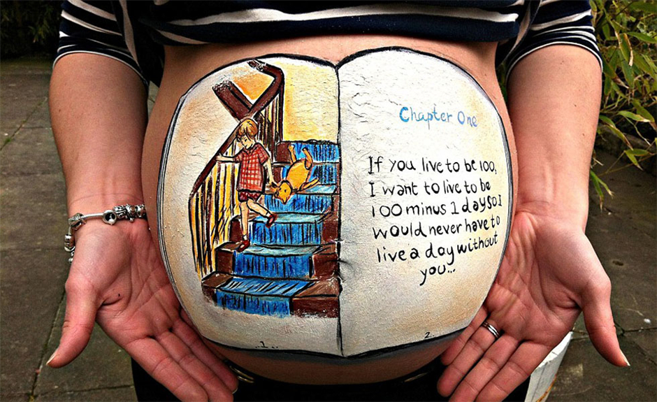 图为孕妇肚皮上的小熊维尼故事书(网页截图)