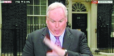 “谈到内阁改组的情况……”政治评论员亚当-博尔顿说到这里时面容突然扭曲了,他突兀地停顿了几秒。“亚当,亚当,需要暂停一下吗?”当他在镜头前明显吞了什么东西之后,一位演播室工作人员的声音突然插入:“我知道你得不停地说,可是你还好吗?”