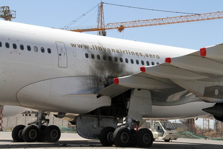 7月16日,在利比亚的黎波里,一架飞机遭火箭弹击中损毁。
