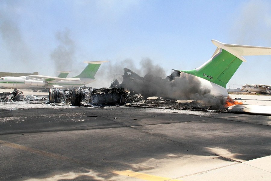 7月16日,在利比亚的黎波里,一架飞机遭火箭弹击中损毁。