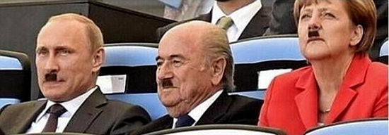 网友给俄罗斯总统普京、国际足联主席布拉特以及德国总理默克尔ps上小胡子。