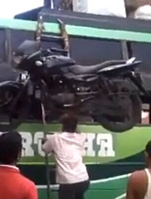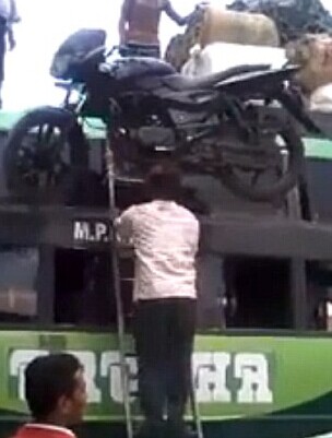英国《每日邮报》7月16日发布了一段视频,视频中一位印度男子在另外四人的帮助下,将一辆摩托车放在头顶,几秒钟后,他找到了平衡,之后便用双手扶着梯子,稳稳地顶着摩托车爬上了一辆巴士。当他到达梯子顶端时,车顶的两名男子帮他将头顶的摩托车卸下,固定在巴士车上。