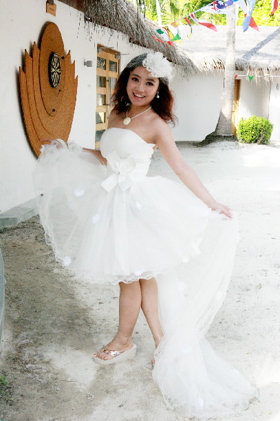 一名新婚游客向记者展示美丽婚纱。新华网记者黄海敏