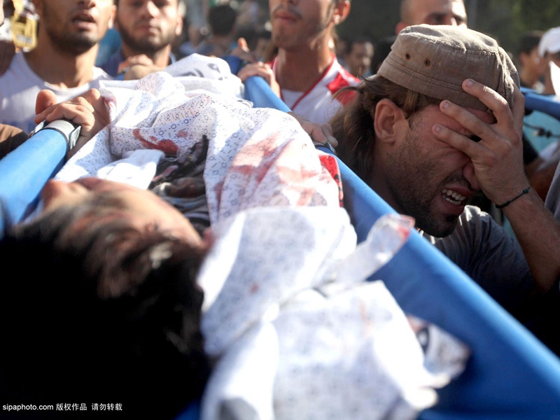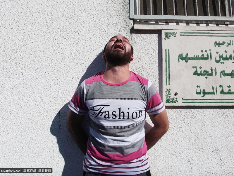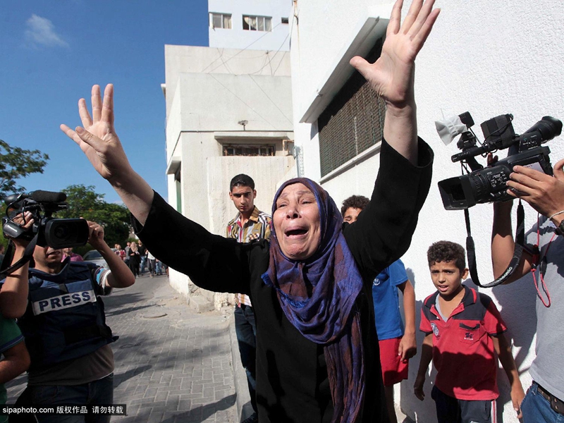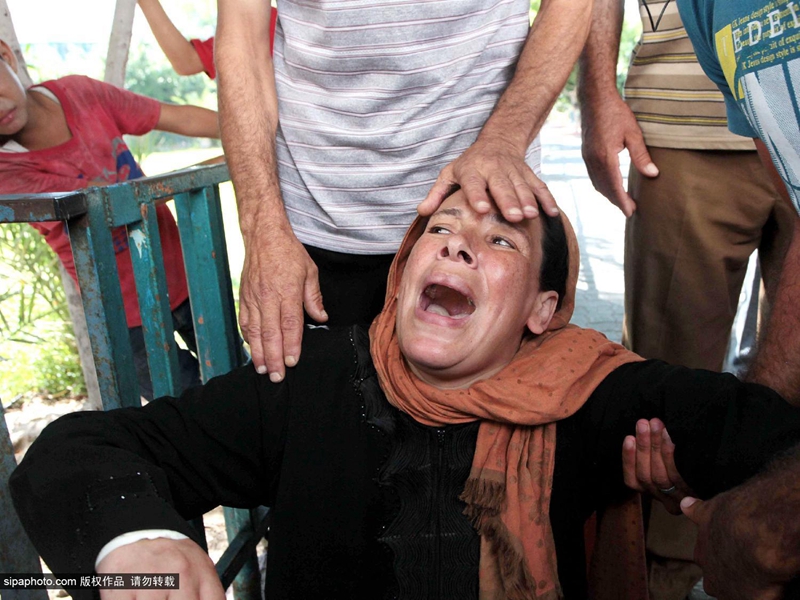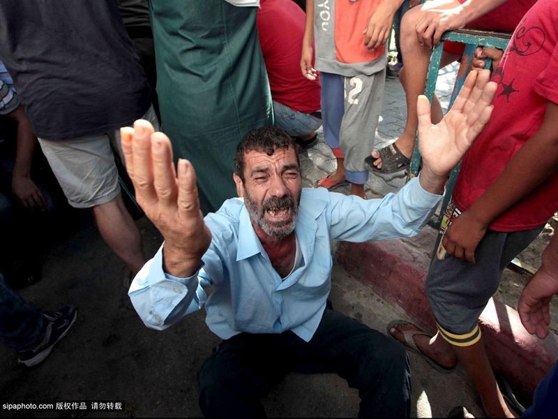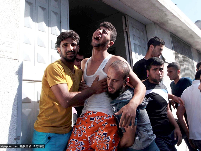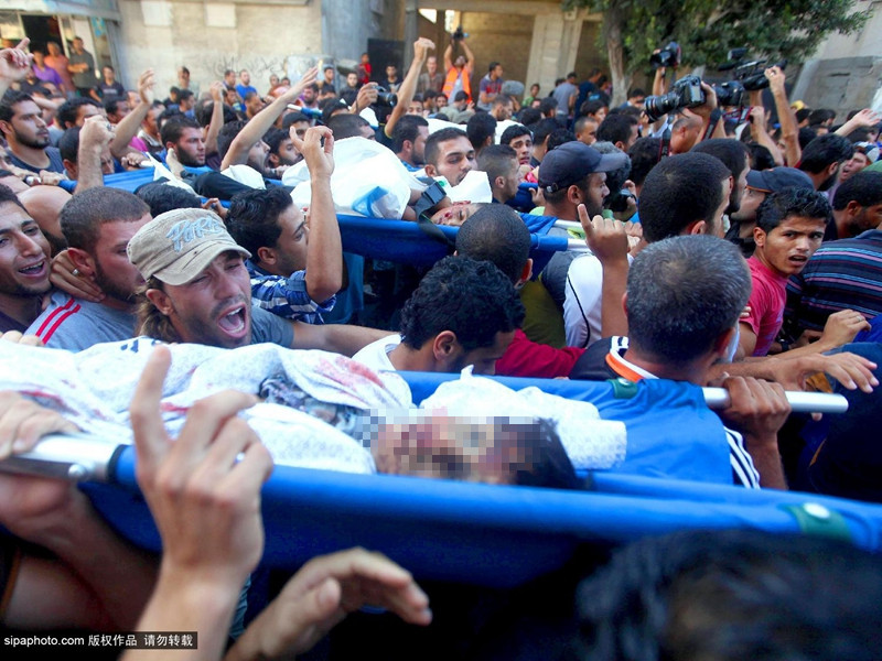 当地时间2014年7月16日,巴勒斯坦加沙地带,四名巴勒斯坦儿童在加沙上被以色列海军炮舰发射的一枚炮弹打死,一名儿童重伤。图为悲伤的父母们。(图片来源:希帕中国)