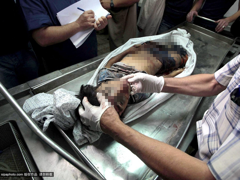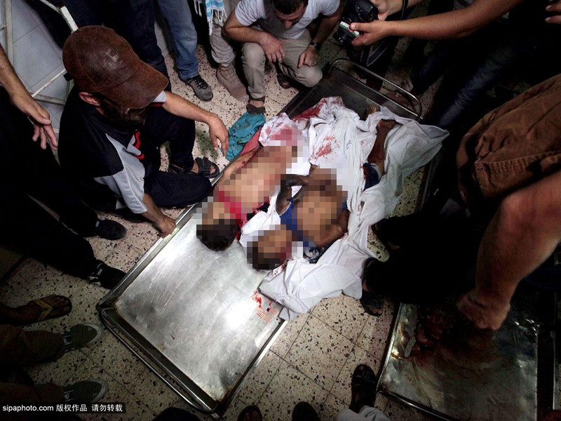 当地时间2014年7月16日,巴勒斯坦加沙地带,四名巴勒斯坦儿童在加沙上被以色列海军炮舰发射的一枚炮弹打死,一名儿童重伤。(图片来源:希帕中国)