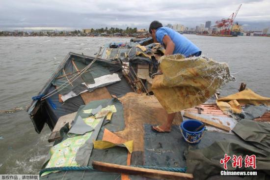 当地时间16日,强台风“威马逊”袭击菲律宾。台风造成菲律宾首都马尼及周边地区大量房屋被毁,并造成断电。图为台风过后一个男子在补救破损得房屋。