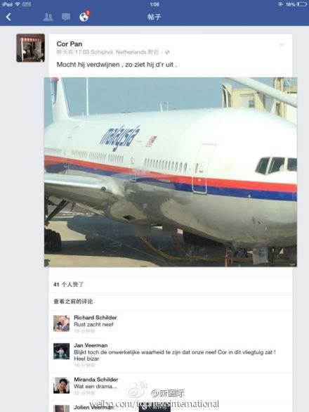 新华网北京7月18日电 据新华社新国际微博报道,“万一这架飞机失踪的话,它就长这样子,”这是一名荷兰人在社交媒体上发布一张马航飞机照片后写下的说明。这一立此存照的小幽默可能一语成谶。尽管尚未确认发帖人的确就在坠毁的MH17航班上,但从其发帖时间来看,不少人担心这名贴主登上了这架在乌克兰坠毁的航班。