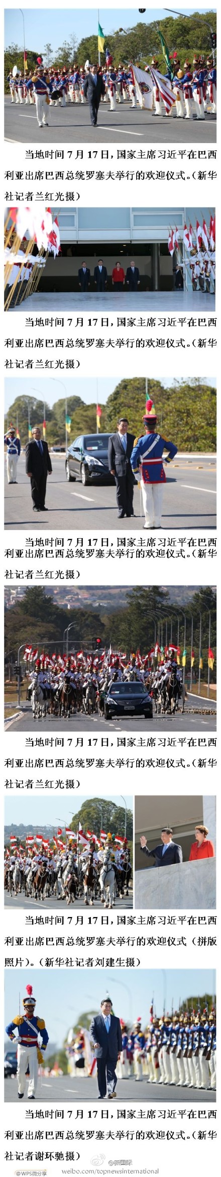 新华网北京7月18日电 据新华社“新国际”微博报道,17日,巴西总统罗塞夫为习近平举行隆重欢迎仪式。在总统府入口处,习近平与罗塞夫亲切握手、问候。军乐团奏中巴国歌,升中国国旗,鸣礼炮21响。随后,两位元首一同登上观礼台,观看仪仗队分列式。骑兵马队簇拥着军旗,奔腾跳跃,奋蹄疾驰。
