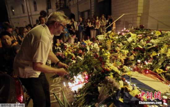 7月17日,乌克兰基辅,民众们手持鲜花和蜡烛在荷兰驻乌大使馆前悼念马航MH17事故遇难者。