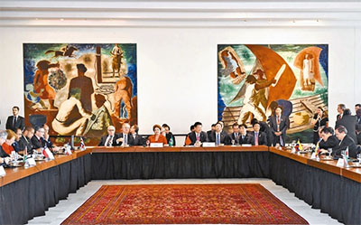 会晤开始前,习近平与罗塞夫共同迎接出席会晤的拉美和加勒比国家领导人和代表,同他们一一握手并集体合影。