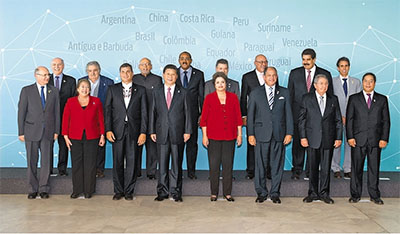 当地时间7月17日下午,中国—拉美和加勒比国家领导人会晤在巴西利亚举行。本次会晤由中方倡议,中国国家主席习近平、巴西总统罗塞夫、哥斯达黎加总统索利斯、古巴国务委员会主席兼部长会议主席劳尔·卡斯特罗、厄瓜多尔总统科雷亚、苏里南总统鲍特塞、哥伦比亚总统桑托斯、智利总统巴切莱特、圭亚那总统拉莫塔尔、乌拉圭总统穆希卡、委内瑞拉总统马杜罗、安提瓜和巴布达总理布朗等出席。
