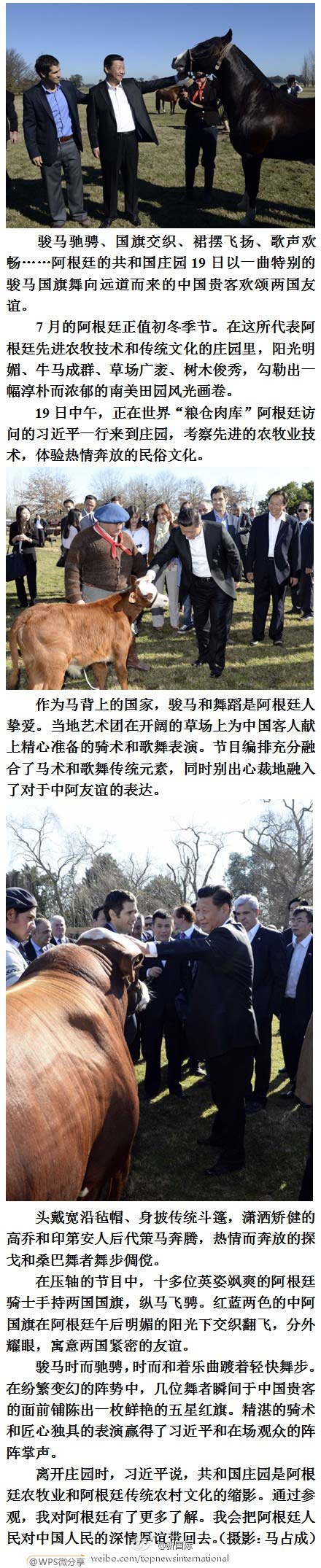 新华网北京7月20日电 据新华社“新国际”微博报道,骏马驰骋、国旗交织、裙摆飞扬、歌声欢畅……阿根廷的共和国庄园19日以一曲特别的骏马国旗舞向远道而来的中国贵客欢颂两国友谊。