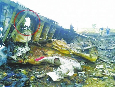 从这张残骸照片来看,机身上有比脸盆略大的孔洞,破坏方向从机体外部冲向内部,怀疑是导弹的战斗部碎片击中的一块区域。