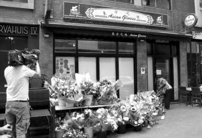 民众在鹿特丹一家中餐馆前悼念马航空难中遇难的华人夫妇。新华社发