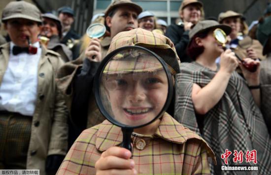 当地时间2014年7月19日,英国伦敦,民众头戴猎鹿帽、身着斗篷、手持烟斗和放大镜,装扮成小说中的虚构人物福尔摩斯,试图创造最多人假扮福尔摩斯集会的吉尼斯纪录。