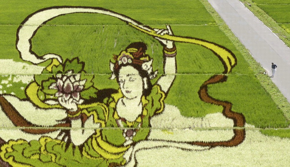 日本青森县田舍馆村用水稻种出“仙女图”(网页截图)