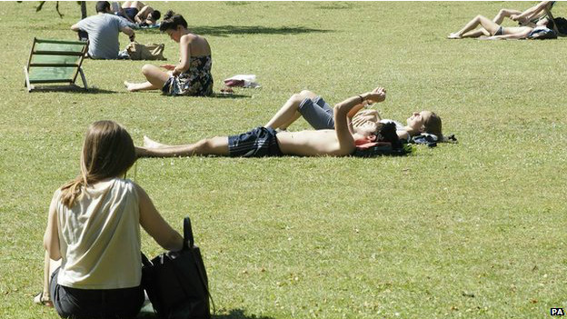 气象预报表示高温将持续多日。图为英国民众在草地上晒日光浴。