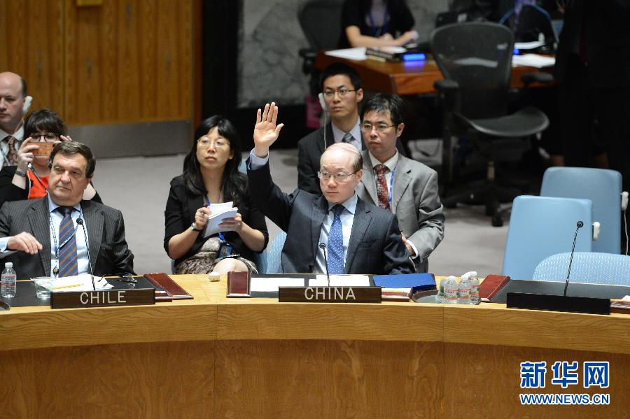 7月21日,在纽约联合国总部,中国常驻联合国代表刘结一(中)参加安理会就决议草案进行的表决。联合国安理会21日通过决议,强烈谴责马来西亚航空公司MH17航班坠毁事件,同时敦促各方充分配合对这一事件的国际调查。新华社记者牛晓雷摄