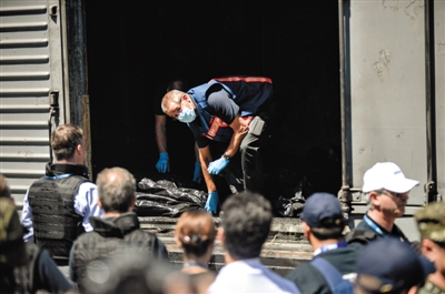 乌克兰托列兹,欧安组织代表登上装载遇难者遗体的冷藏车进行检查。