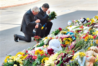 21日,基辅,乌克兰总统波罗申科在荷兰驻乌克兰使馆外敬献鲜花。