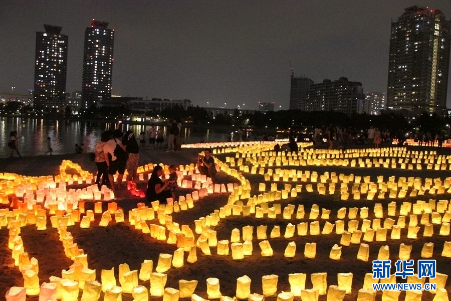 7月的第三个周一是日本的“海之日”,东京的台场海滨公园每年都举行“海灯节”活动庆祝海之日的到来,今年已经是第11届,成为台场地区夏季一道亮丽的风景。海灯节每年都从海之日的前一天开始,持续两天。在海湾对面雄伟的彩虹桥映衬下,约3万盏祈祷海洋安全的七彩纸灯在海滨的沙滩上,编织出梦幻般的意境。利用纸灯摆放出造型和点燃蜡烛的工作完全由应征的志愿者承担。今年海灯节的主题是“从台场看东京的魅力夜景”,主办方希望东京市民能够关掉家里的电灯,到台场海滨欣赏这里绚烂的烛光。新华网记者蓝建中摄