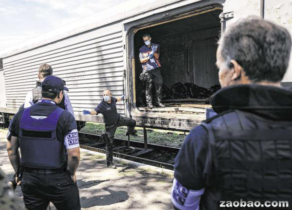 欧洲安全与合作组织(OSCE)监督人员和荷兰法医专家昨天进入火车冷藏车厢,准备展开辨认遗体的工作。(图片来源:联合早报网)
