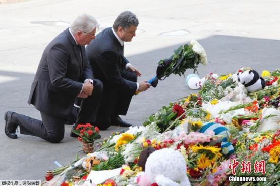 当地时间7月21日,乌克兰基辅,乌克兰总统波罗申科在荷兰驻乌克兰大使馆外悼念马航MH17遇难者。