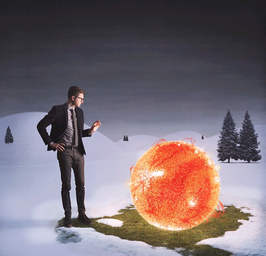 兹尔默站在从天空中掉下的太阳旁边,看着其将周围的雪融化掉。(网页截图)