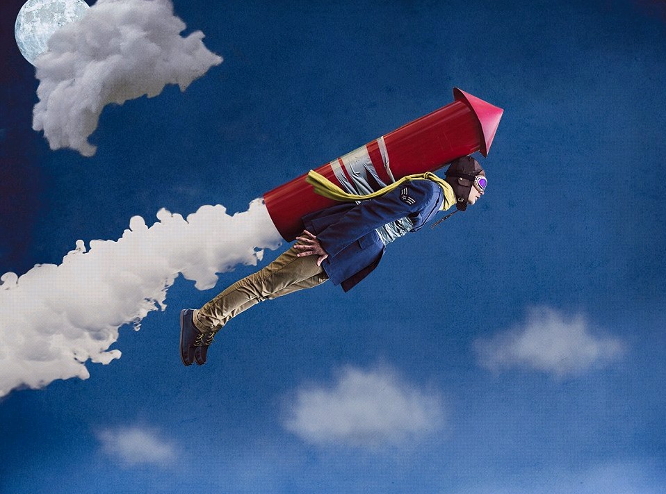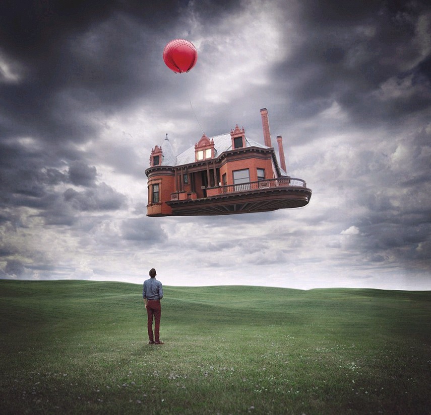 过去1年中,兹尔默每天都会拍摄照片,然后将它们变成超现实场景。图中,他正凝视一栋随着气球漂浮的房子。(网页截图)