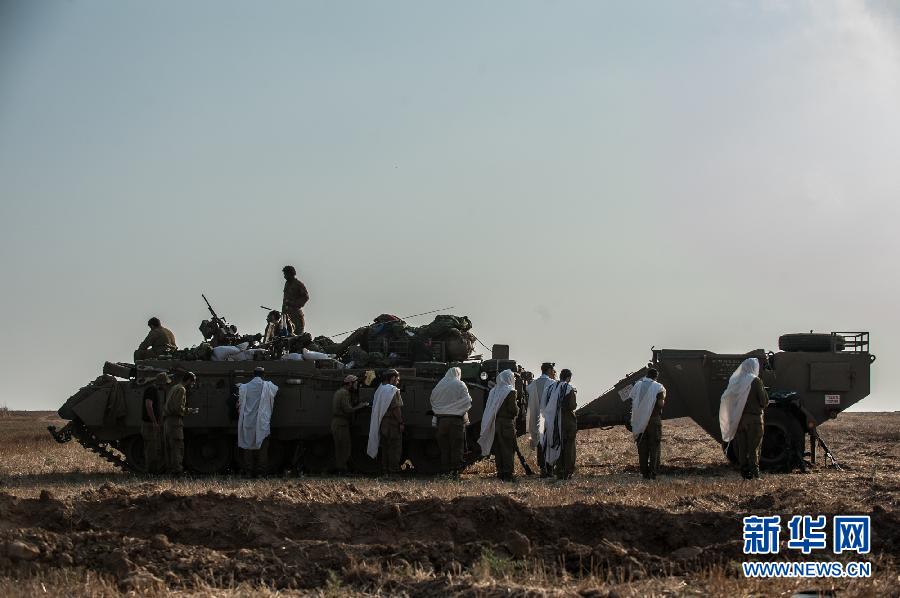 7月20日,在以色列南部与加沙的边境,以军装甲部队士兵在田野中祷告。
