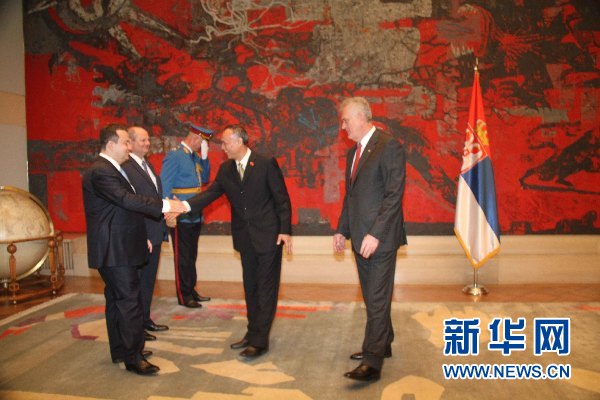递交国书后,塞尔维亚总统尼科利奇(右1)向李大使介绍出席仪式的塞政府官员。李大使(右2)与塞副总理兼外交部长(左)握手。(汪慧 摄)