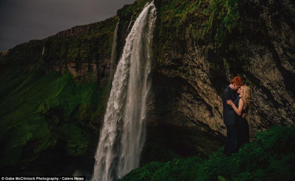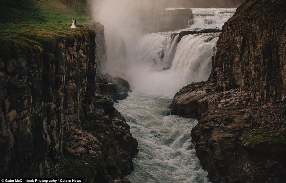 两人在冰岛的瀑布和山脉间拍摄自己独特的婚纱照。