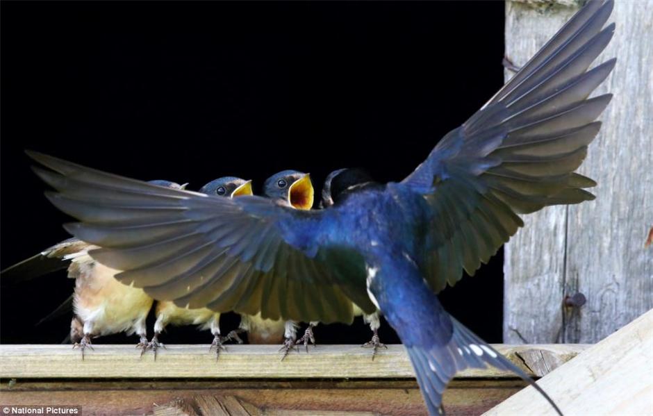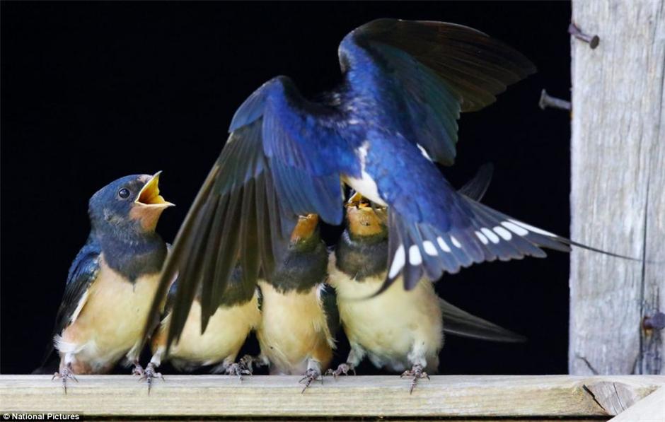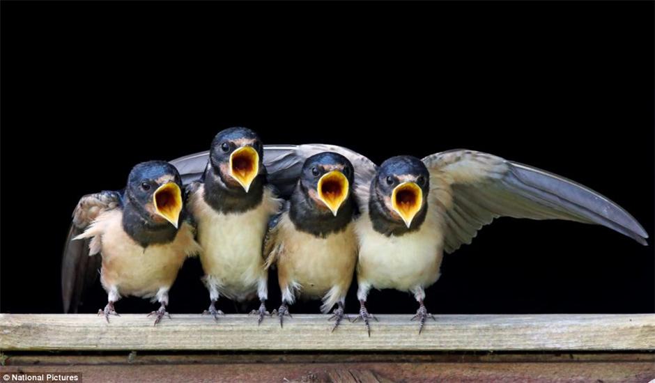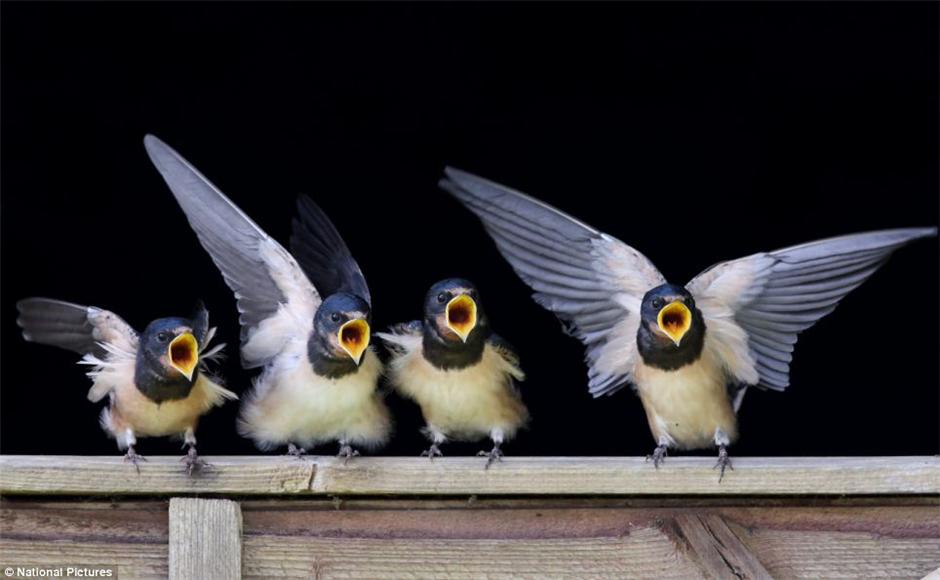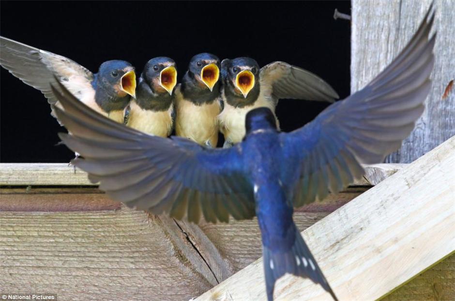 沃德说,在等待食物的时候小燕子们的小脑袋就像木偶一样摇摇摆摆。当燕子妈妈来的时候,每只小燕子都争抢着,好像在叫“我,我”,它们实在太可爱了。