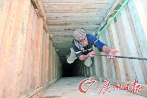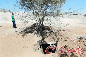 不过,有一截绳子露在洞外面,顺着绳子滑到地下7.5米深的地方,垂直的地洞出现了转弯,变成了狭窄的地道,宽和高都只有0.9米,人必须蜷起身子,趴在地上,匍匐前进。忍耐半个多小时,爬上1.5公里的路程,就会抵达埃及的西奈半岛。地道里空气污浊,越往里爬呼吸越感困难。据介绍,在地道里待上半小时就会有缺氧危险。当地人于是用千斤顶将一根超长空心钢管顶出地面,方便“吸氧”。