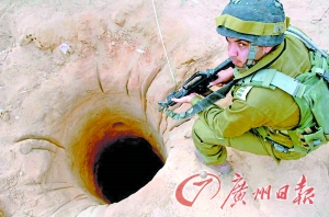 一名以色列士兵站在一个地道的出口处警戒。