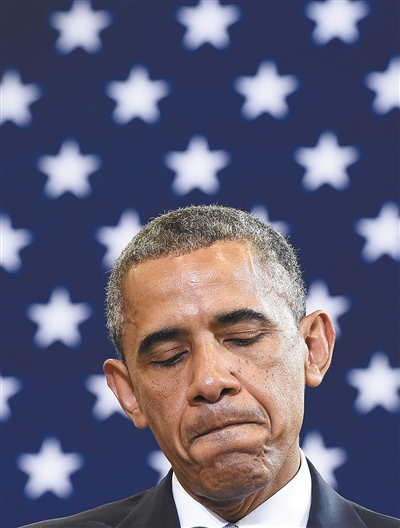 7月21日,奥巴马在华盛顿一个市政厅会议上发表演讲,表情凝重。