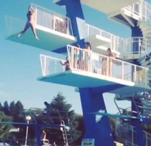 据英国《每日邮报》7月28日报道,美国一名女子在爱达荷州熔岩温泉水上乐园7米高跳台上跳水时,因过于紧张而显得犹豫不决。在起跳最后时刻,她改变主意,想要极力抓住跳板护栏。结果先是摔在下层跳台上,后又落入水中。