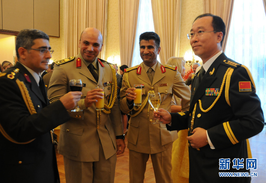 7月30日,中国驻罗马尼亚大使馆陆、海、空军武官隗延伟大校(右一)与来宾举杯庆祝中国人民解放军建军87周年 。