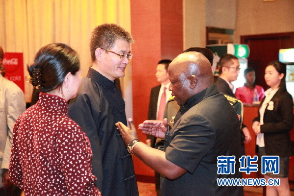 中国驻赞比亚大使杨优明(中)与赞比亚国防部副部长约瑟夫·伦古(右)在招待会上交流。