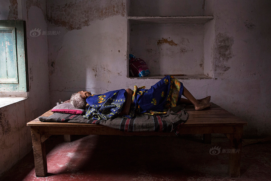 2014年6月18日,105岁的Munna Kuvar躺在Mukti Bhavan里的床上。她的丈夫在18年前在这个旅馆过世,Kuvar也希望能在同一个地方死去。她的亲戚放下工作陪她来到这里。