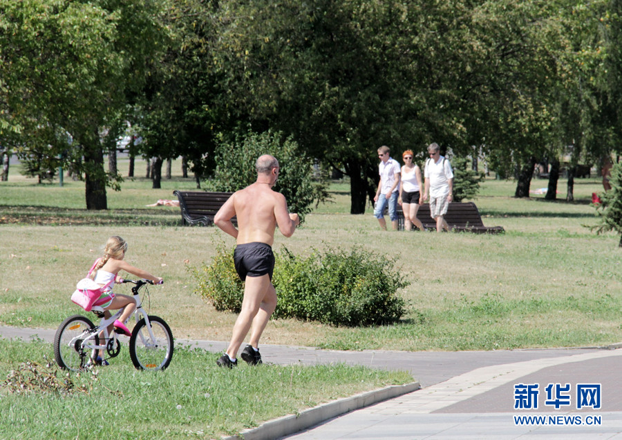 图为一名父亲带着骑自行车的女儿在明斯克公园正午的阳光下锻炼。新华网记者 陈俊锋 摄