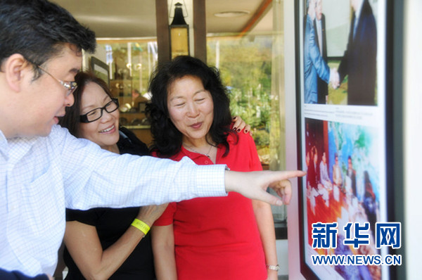 中国驻里约总领事宋扬(左一)与旅巴华侨一起观看图片展。