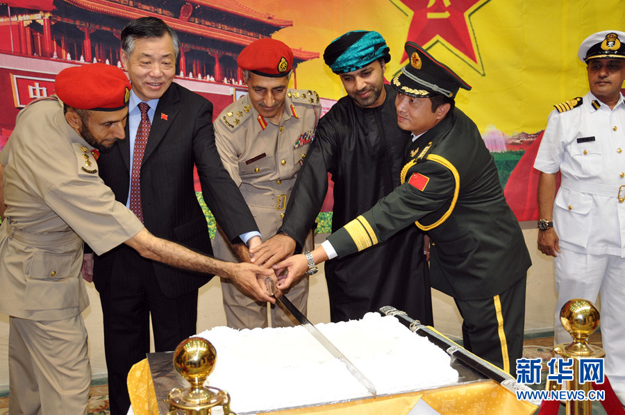 中国驻阿曼大使吴久洪(左二)、中国驻阿曼大使馆武官王瑞正(左五)与来宾一道切蛋糕。新华网记者 孙磊 摄