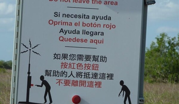 在2001年首次安装这类指示标志时,仅使用英文和西班牙文。而目前,可让受困偷渡客向边界巡逻队求救的指示“紧急求助牌”里,将英文、中文、西班牙文三种语言并列。