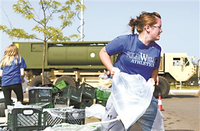 当地时间8月3日,美国俄亥俄州托莱多,排球教练Megan Anllo拿着一袋水。据报道,美国俄亥俄州第四大城市托莱多宣布,当地自来水因检测出藻类产生的毒素已不适于安全饮用。图片/IC