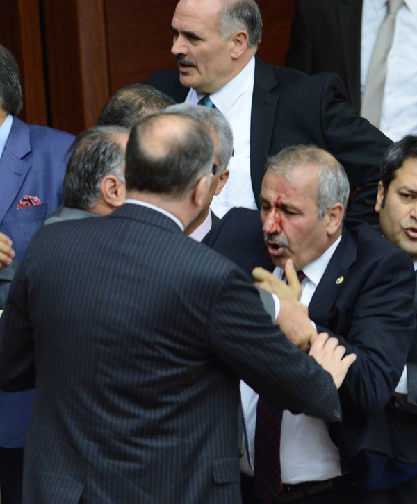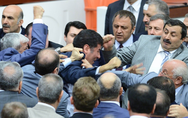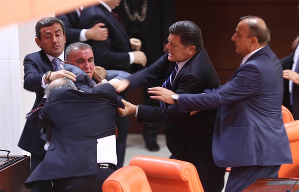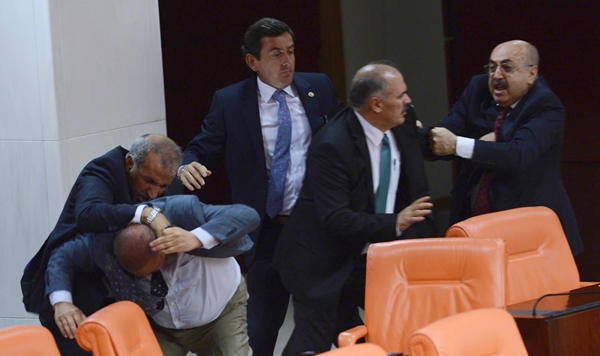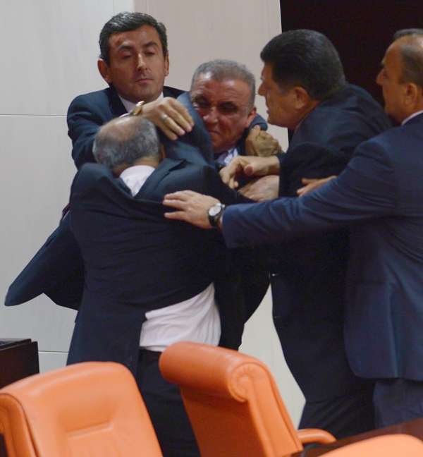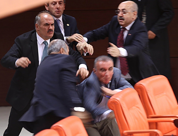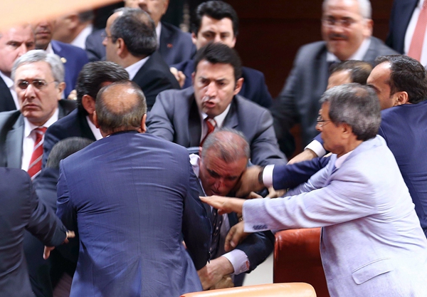 2014年8月4日,土耳其第二大反对党民族主义者行动党同执政党在土耳其安卡拉议会上发生冲突。冲突发生在土耳其反对党和执政党议员之间,双方就建立委员会应对邻国伊拉克的激进的伊斯兰主义产生冲突。图片来源:AFP