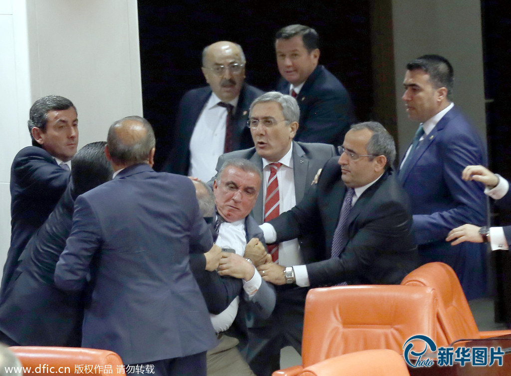 当地时间2014年8月4日,土耳其安卡拉,土耳其总理埃尔多安所属的正义与发展党立法委员和民族行动党在国会上就是否该对伊斯兰军队加入伊拉克与叙利亚战争一事展开调查产生冲突,双方拳打脚踢。3名官员受伤,会议被迫延期。图片来源:东方IC