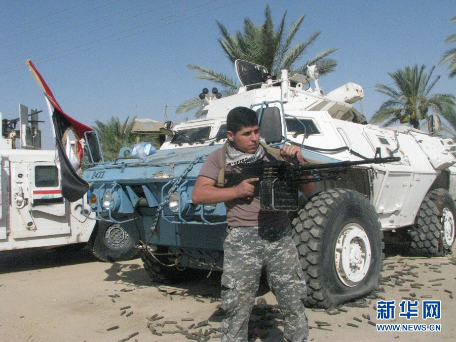 7月27日,在伊拉克萨拉赫丁省杜卢伊耶镇,一名伊拉克警察站在装甲车前。在过去一个多月,当地部族武装联合伊拉克军队和警察等安全部队,共同抵抗“伊斯兰国”极端组织分子的进攻。杜卢伊耶镇位于首都巴格达以北大约90公里。(新华网 夏兰· 朱布里 摄)