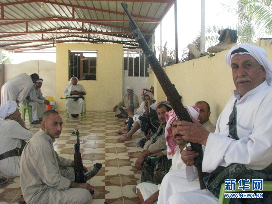7月27日,在伊拉克萨拉赫丁省杜卢伊耶镇,伊拉克部族武装在开会。在过去一个多月,当地部族武装联合伊拉克军队和警察等安全部队,共同抵抗“伊斯兰国”极端组织分子的进攻。杜卢伊耶镇位于首都巴格达以北大约90公里。(新华网 夏兰· 朱布里 摄)