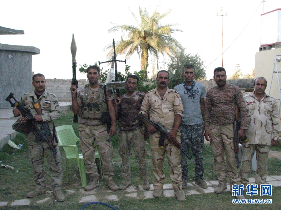 7月29日,在伊拉克萨拉赫丁省杜卢伊耶镇,伊拉克士兵和警察在战斗间隙。在过去一个多月,当地部族武装联合伊拉克军队和警察等安全部队,共同抵抗“伊斯兰国”极端组织分子的进攻。杜卢伊耶镇位于首都巴格达以北大约90公里。(新华网 夏兰· 朱布里 摄)